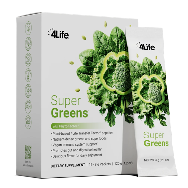 4Life Super Greens – это высокоэффективный комплекс на растительной основе, обеспечивающий организм целостным питанием из богатейших по нутриентам зелёных овощей, злаков и корнеплодов. Это единственный в мире продукт в своей категории, усиленный технологией PhytoFactor™ — биоактивными иммунными пептидами из семян Brassica napus, которые обучают и оптимизируют работу иммунной системы. Super Greens помогает восполнить пробелы в рационе, поддерживает здоровье кишечника и обеспечивает антиоксидантную защиту, способствуя общему оздоровлению и омоложению.