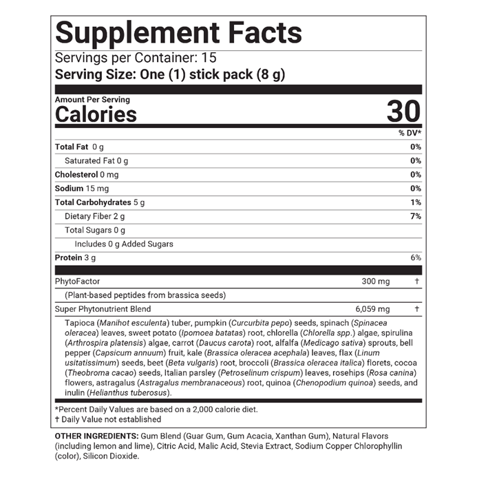 • Фирменная смесь супрафитонутриентов – 6 059 мг: тапиока, тыква (семена), шпинат (листья), батат (корень), хлорелла, спирулина, морковь (корень), люцерна (ростки), перец сладкий (плоды), кале (листья), лён (семена), свёкла (корень), брокколи (соцветия), какао (семена), петрушка итальянская (листья), шиповник (цветы), астрагал (корень), киноа (семена)